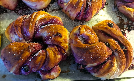 5. Kavla ut degen och bred på fyllningen sedan sylten och sist strö på vaniljsocker. Vik degen på mitten, skär remsor och snurra dem.