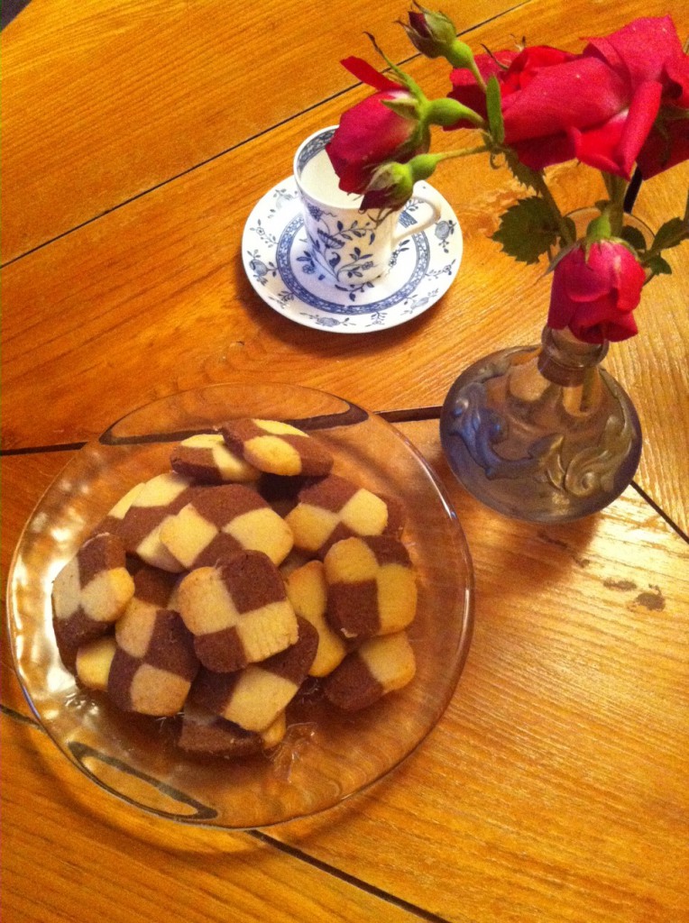 3. Rulla degen i fyra stycken jämna längder. Lägg en ljus längd bredvid en mörk i två lager. Tryck till litegrann. Lägg längderna kallt i kylskåp ett tag. Skär dem sedan i 3-4 mm tjocka skivor.